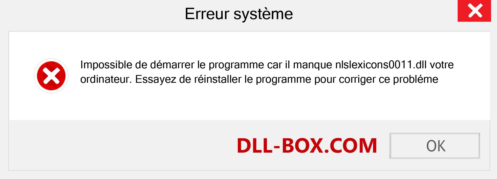 1. Le programme ne peut pas démarrer car nlslexicons0011.dll est absent de votre ordinateur. Essayez de réinstaller le programme pour résoudre ce problème.